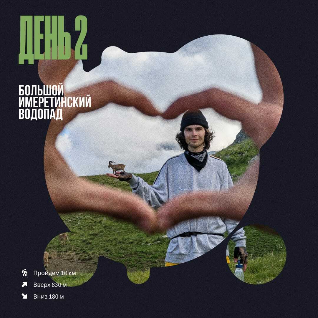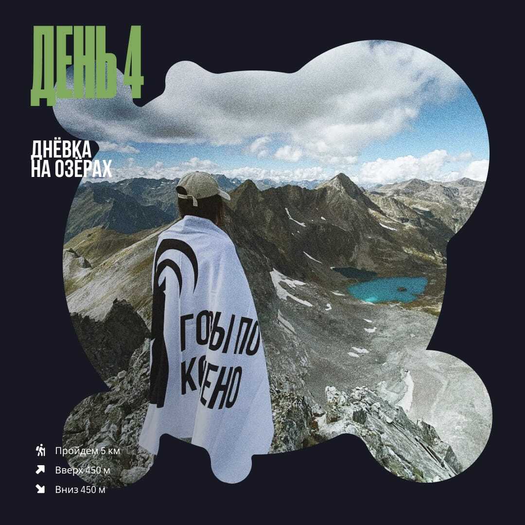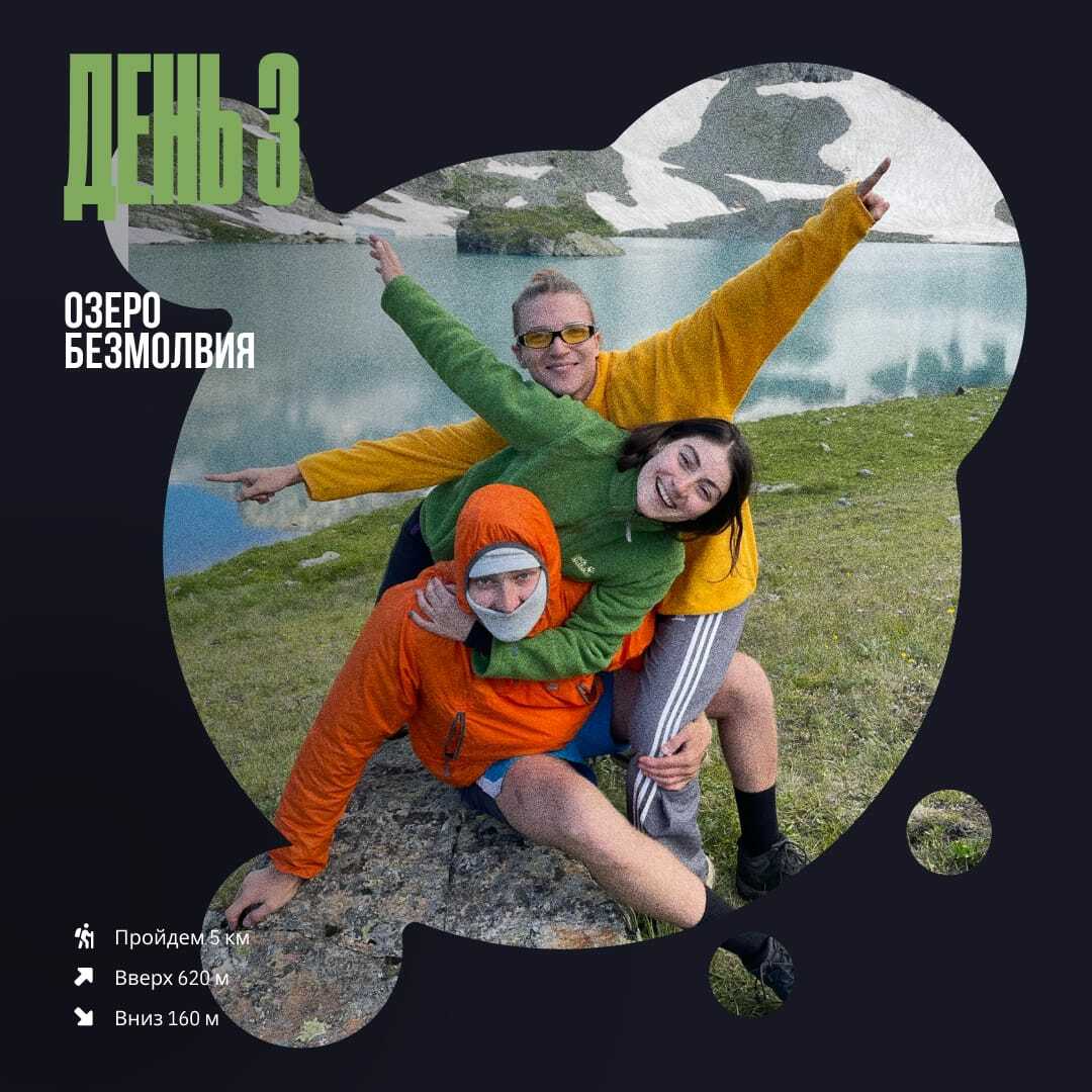 Сегодня будем отдыхать от тяжелых рюкзаков и наслаждаться бирюзовой гладью Имеретинских озёр. После утренней разминки и завтрака налегке отправляемся на прогулку. Поднимемся немного выше, чем вчера, чтобы своим взором охватить панораму всего Имеретинского цирка и запечатлеть ее на холсте. Помедитируем, налепим сочного контента и, насытившись сказкой на яву, вернёмся в лагерь. Вечером сварим вкусный ужин и за кружкой горячего чая будем слушать и рассказывать интересные истории.