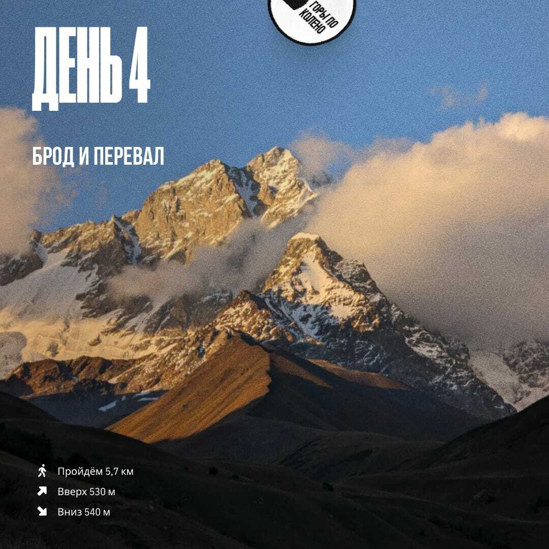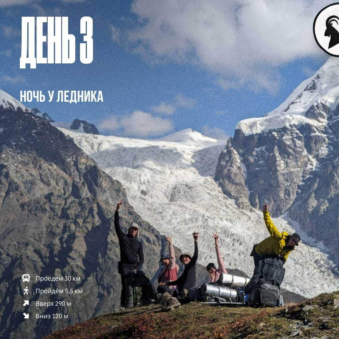 После завтрака грузимся в басик. На нём мы преодолеем горные серпантины и доберемся до изолированного сванского села Адиши, в котором проживают всего 60 человек местного населения. Тут дорога заканчивается, а у нас начинается поход. Лагерь поставим в верховьях ущелья Адишчала, на высоте 2250 м. Налегке отправимся в радиальный выход к леднику Лардаад. Не упустим возможность сделать памятное фото и прикоснуться к языку этого ледяного гиганта, ведь он, как и все ледники Кавказа, стремительно тает. Вечером разведем костер, будем греться и готовить ужин.